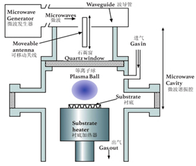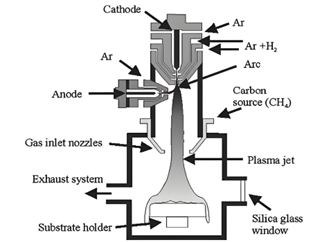 Currently, CVD diamond production methods include the hot filament method, microwave plasma method, DC hot cathode method, and DC arc plasma method. The DC plasma method excels over the other methods due to its fast growth rate and relatively high purity of diamond films. The basic principle of DC plasma diamond film production is shown in Figure (c).
